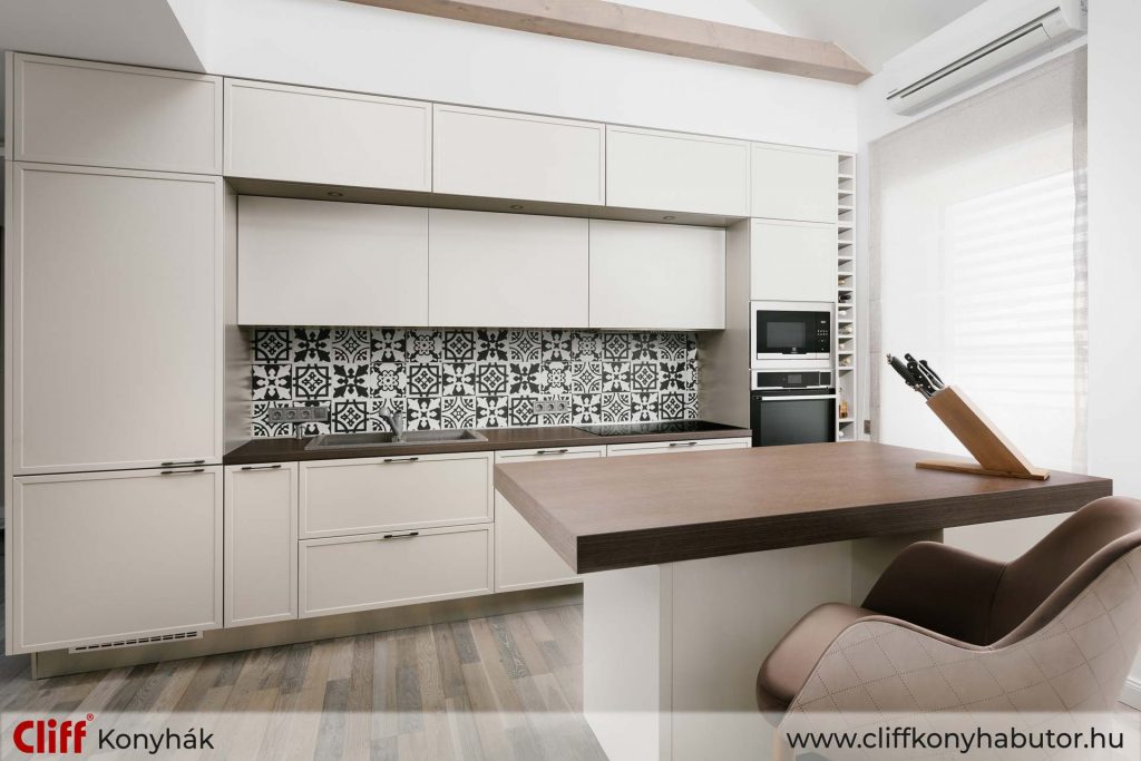 Palazzo modern konyhabútor– Modern álomkonyha képek Selyemfényű bézs Palazzo konyhabútor jól harmonizál a lakás helyiségeinek felületével és hangulatával. A konyhapult mélybarna dió fautánzatú, mely dinamikát és fiatalosságot kölcsönöz a bútornak. Könnyed olaszos stílus igazán letisztult, modern felületekkel tárja elénk a Cliff konyháktól már elvárt elegáns, egyedi megjelenést. A divat változik, a stílus örök. Coco Chanel