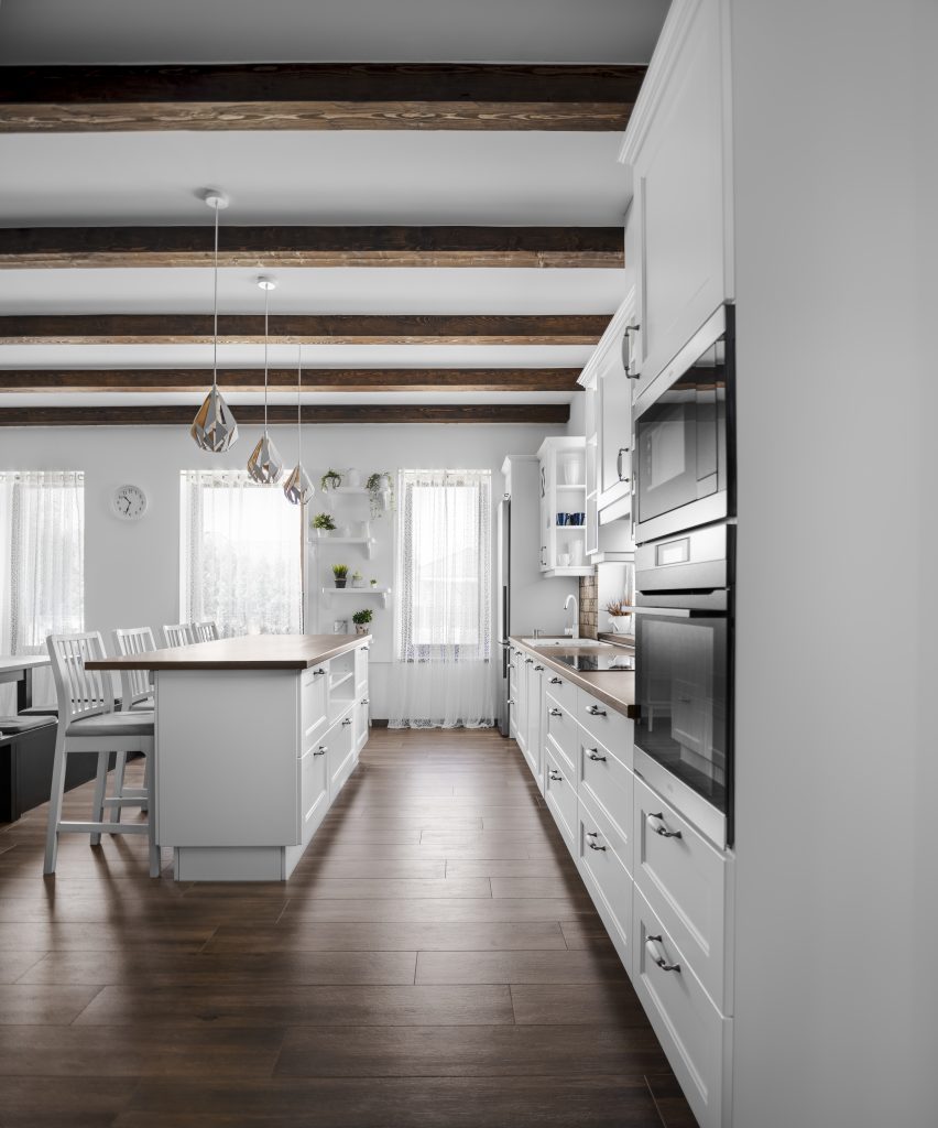 A cél egy igazi vintage hangulat megteremtése volt, aminek teljes harmóniába kellett kerülnie a szoba többi részével. Így a fehér bútorra sötétebb színű fahatású laminált került, ami mennyezeti gerendák és a fapadló megjelenésére hasonlít.
