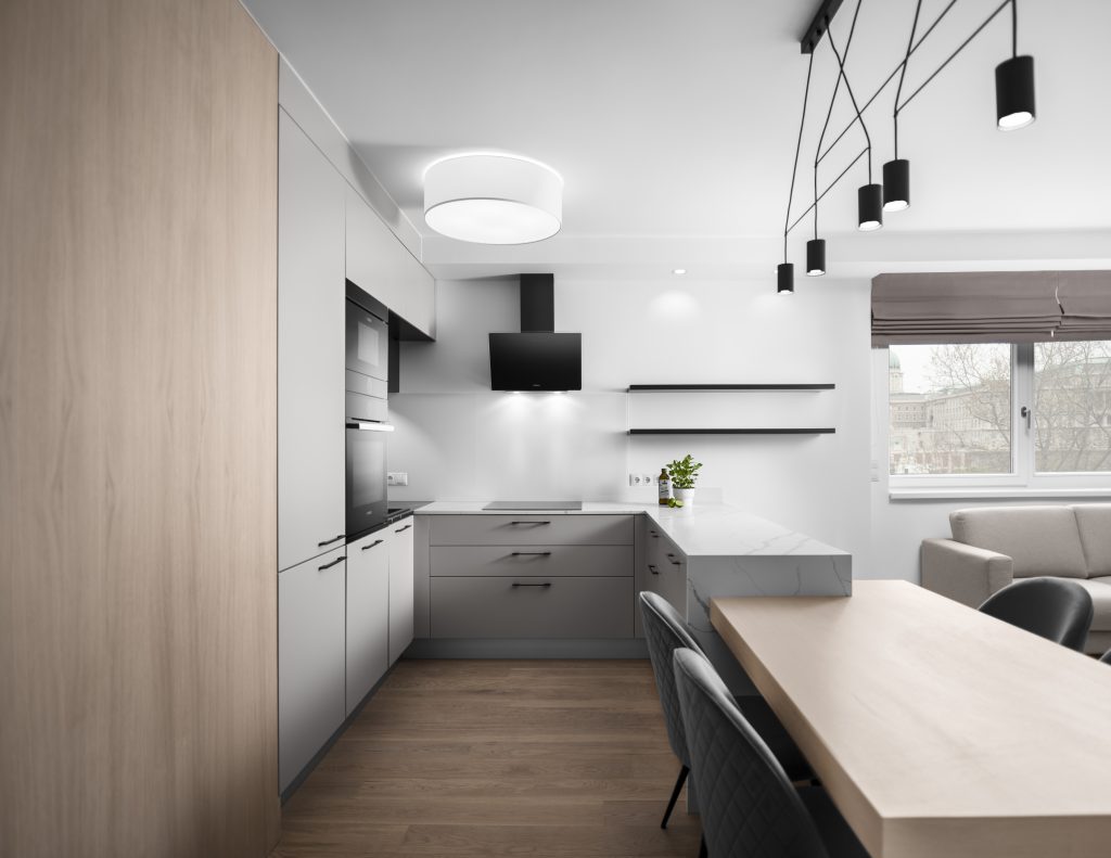 A frontok többségben selyemfényű világosszürke színűek, ugyanakkor a középső elemsor fekete színű frontokkal rendelkezik, ehhez kapcsolódóan a hátfal is fekete alapon fehér márvány mintás. A konyhagépek teljesen fekete színűek, megtartva ezzel a modern megjelenést. A főzőlap és az elszívó között átlátszó üveghátfal található, ami alig észrevehető nem zavarja a szemet. A dekton konyhapult megtörve a sötétebb árnyalatokat; teljesen világos – fehér alapon szürke/fekete márvány mintás.