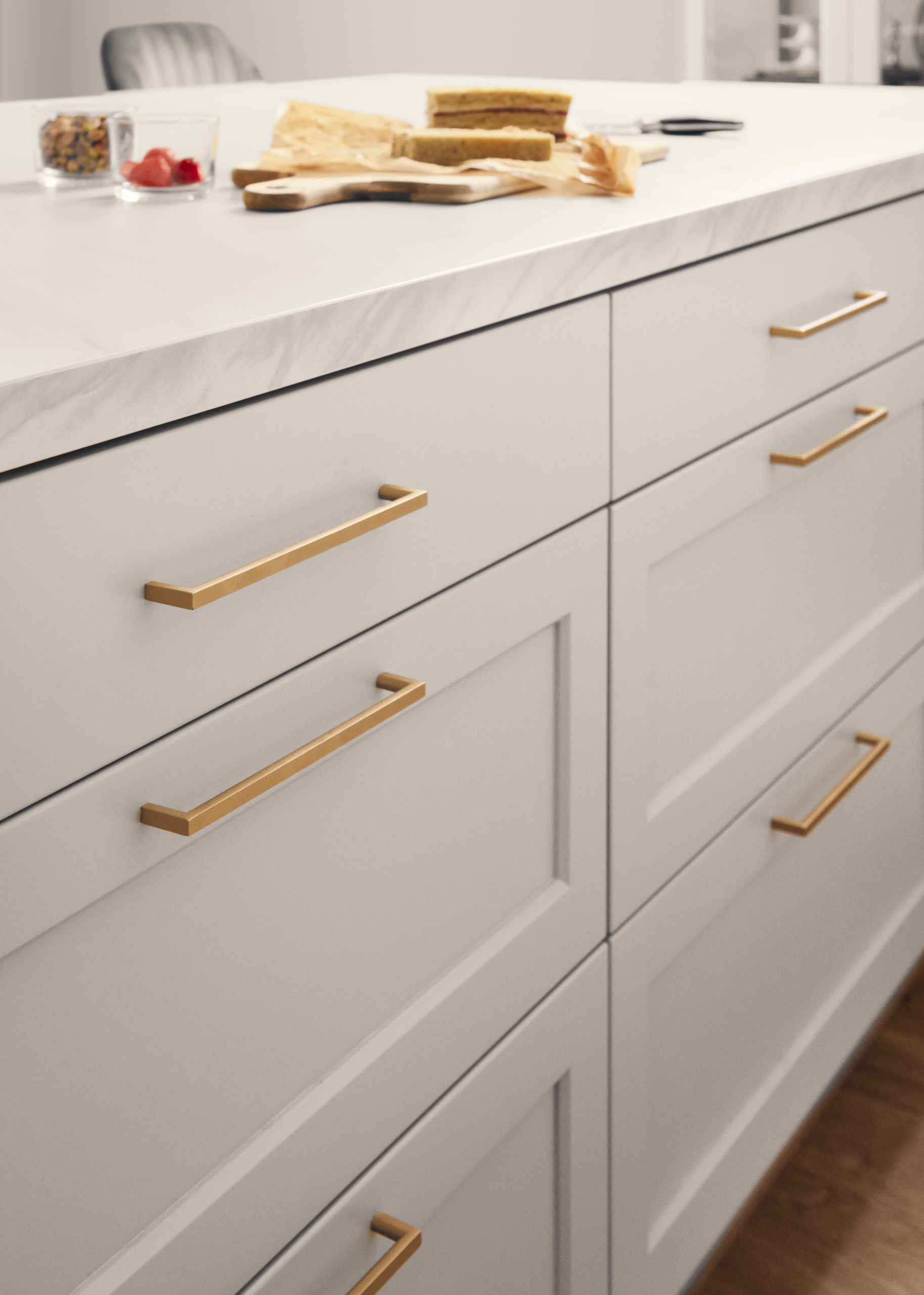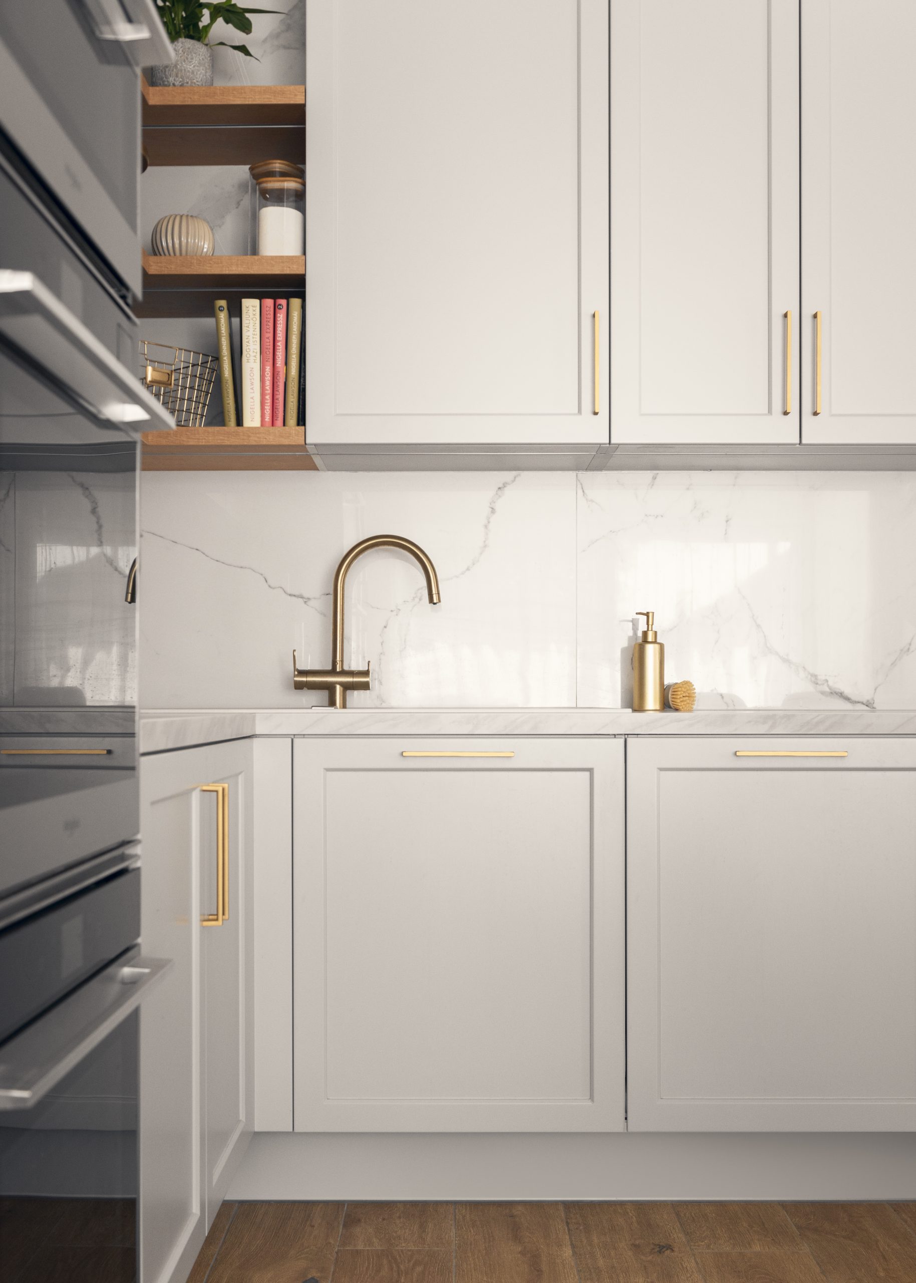 Die Coral-Küchenfront ist an sich einfach und leicht, aber ihre Accessoires – wie die einzigartigen hölzernen Trennwände auf dem Bild – schaffen ein starkes Design.
