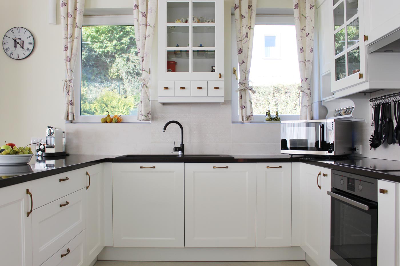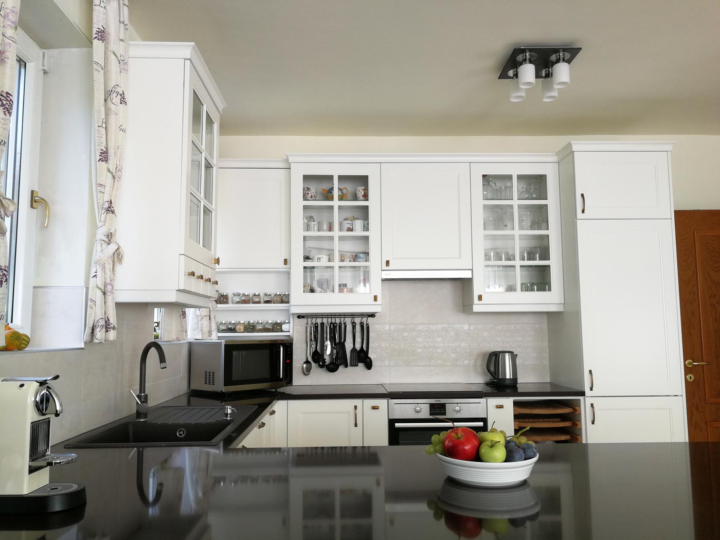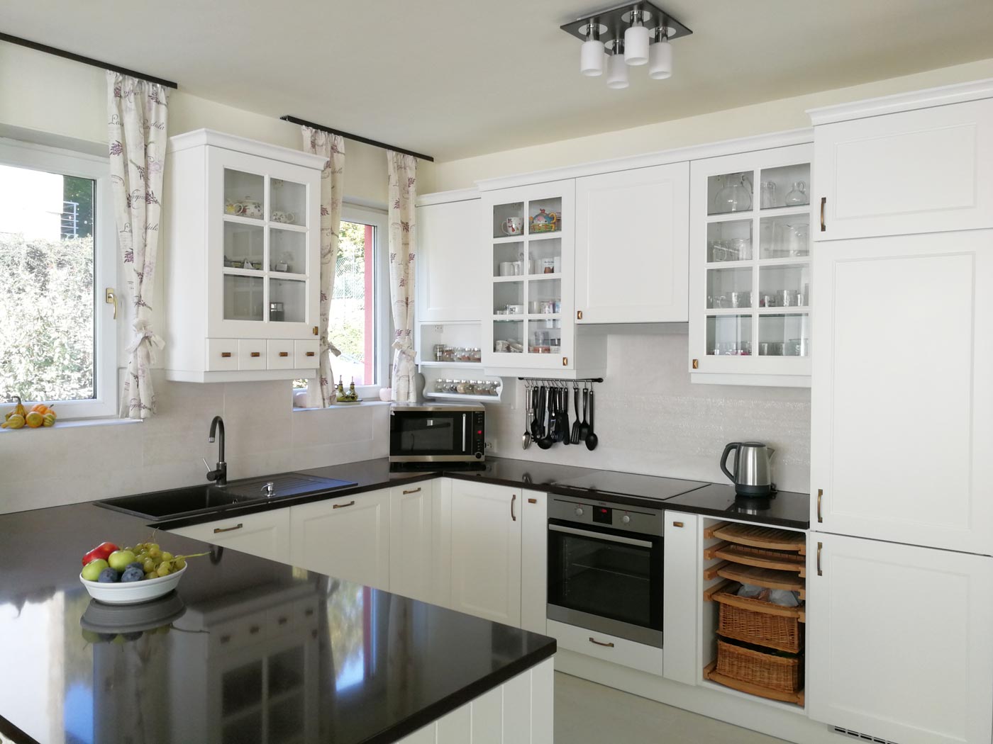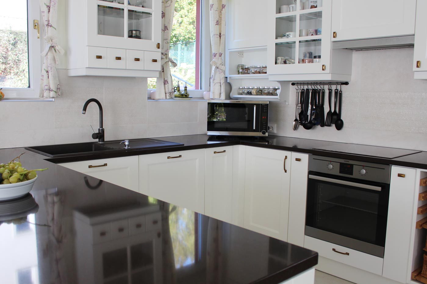 A konyha képek menüpontban fellelhető U alakú konyhához hasonlóan itt is nagyon praktikusan kézre állnak az eszközök és akár többen is kényelmesen elférnek a konyhában. Az U alakot itt egy győnyörű előkészítő és tálalófelület teszi teljessé, ami a fehér konyhabútor által alkotott teret még tágasabbá, szellősebbé teszi.