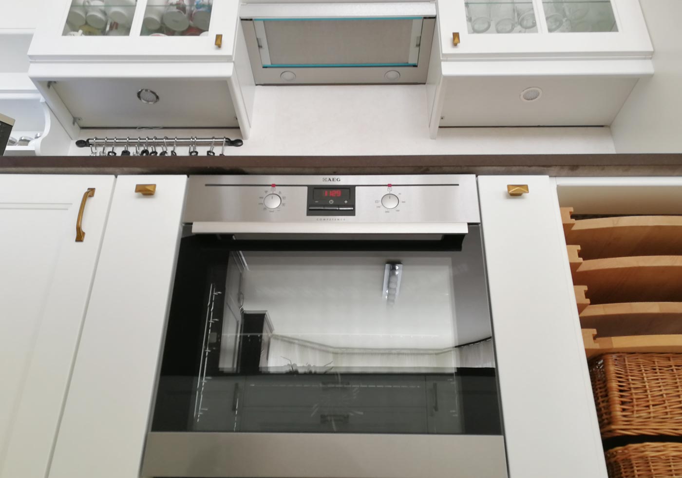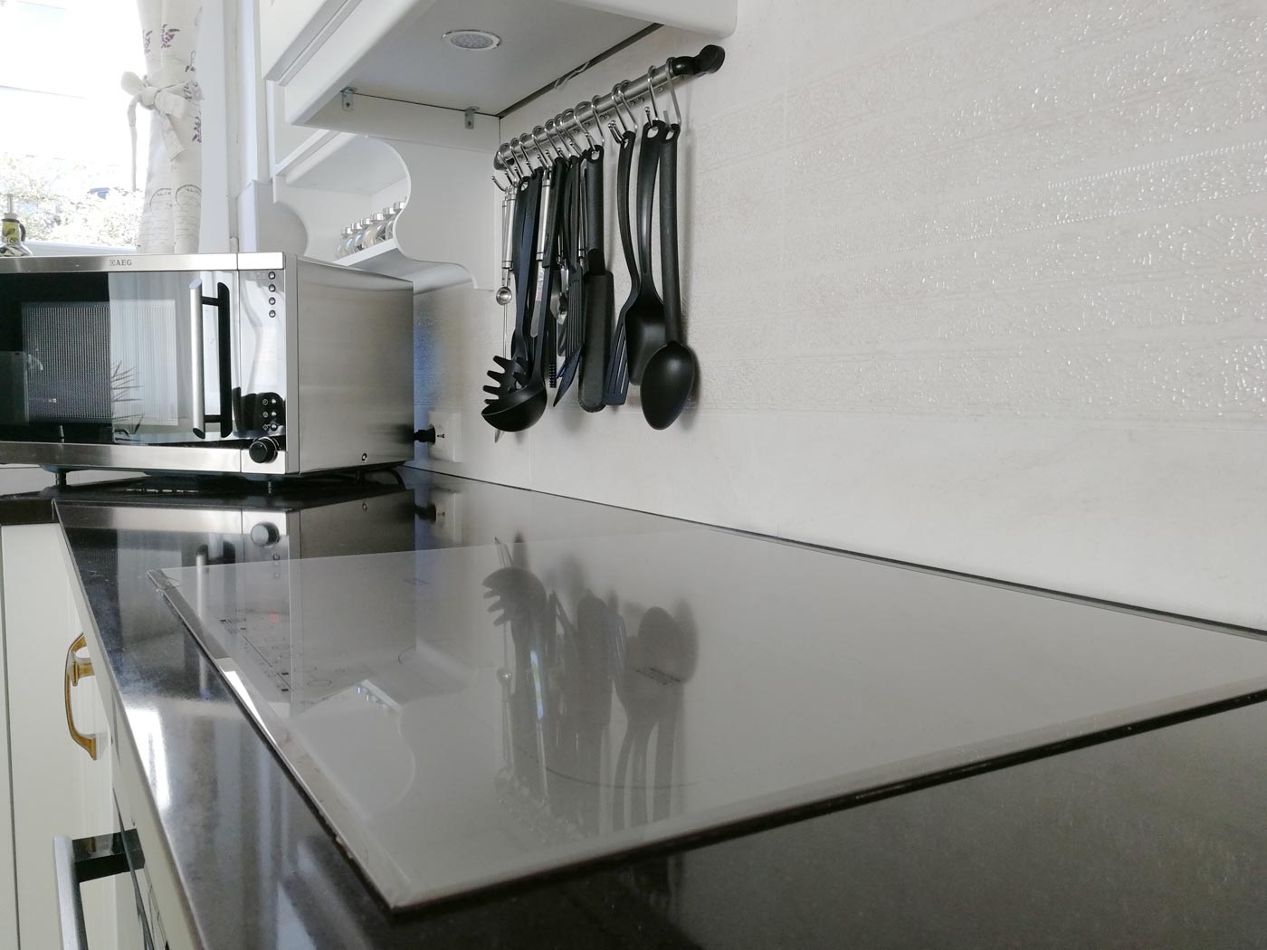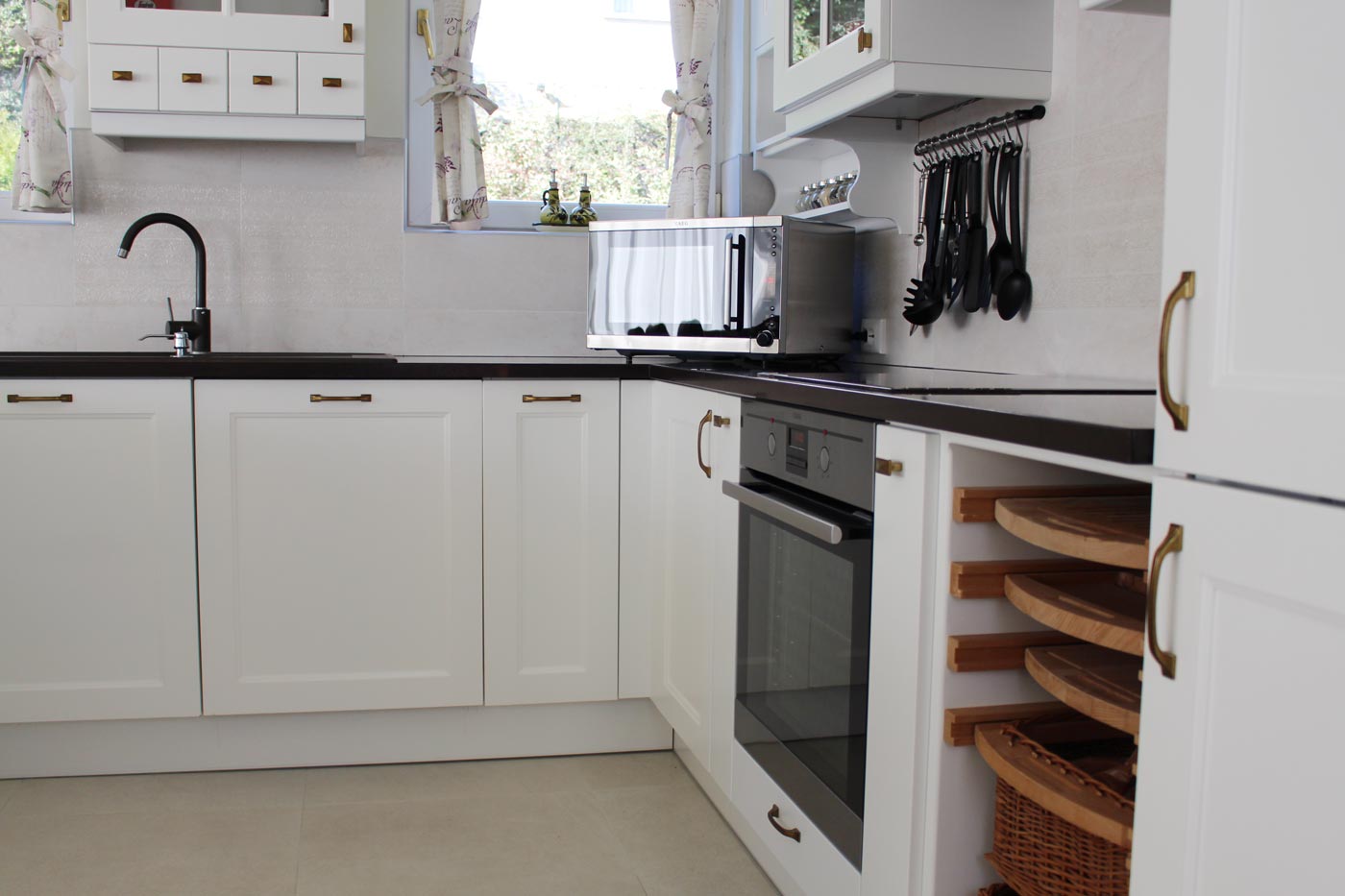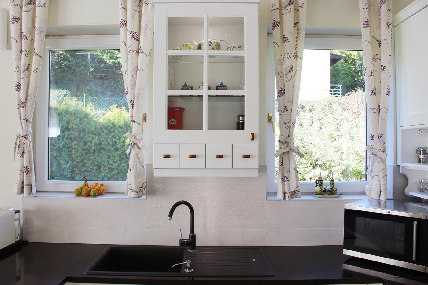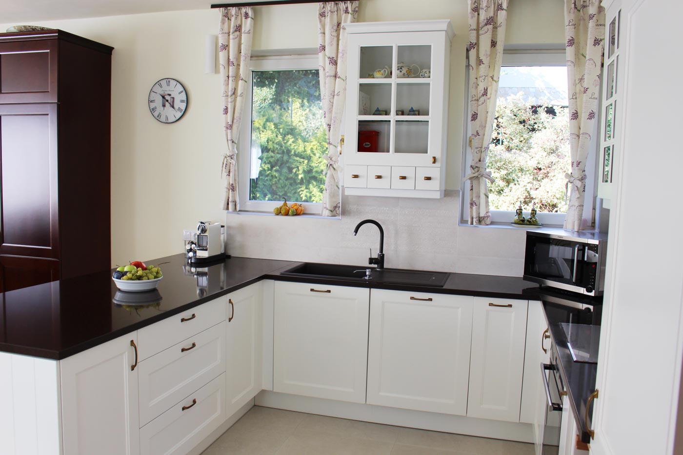 A konyha képek menüpontban fellelhető U alakú konyhához hasonlóan itt is nagyon praktikusan kézre állnak az eszközök és akár többen is kényelmesen elférnek a konyhában. Az U alakot itt egy győnyörű előkészítő és tálalófelület teszi teljessé, ami a fehér konyhabútor által alkotott teret még tágasabbá, szellősebbé teszi.