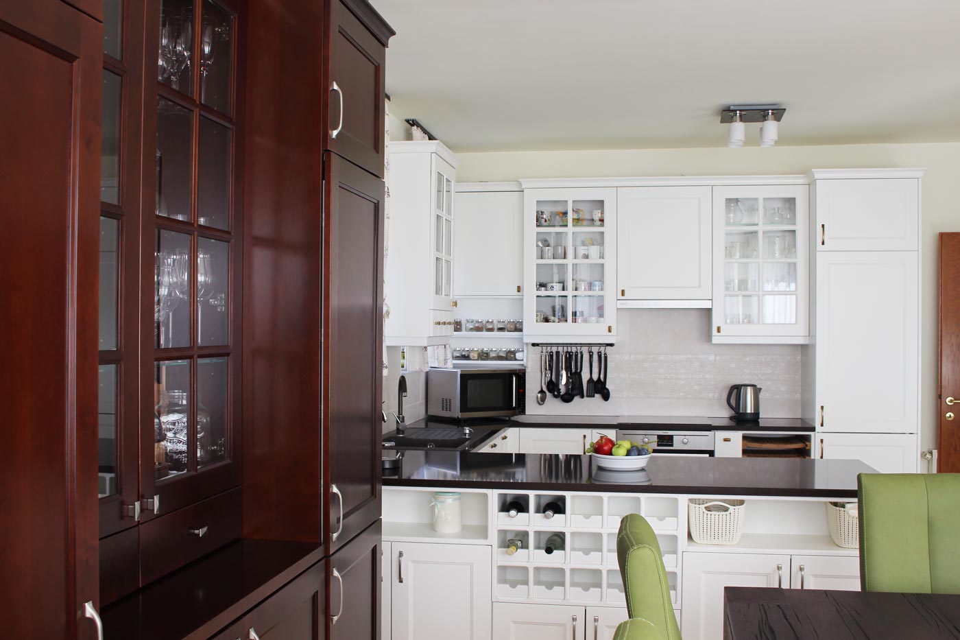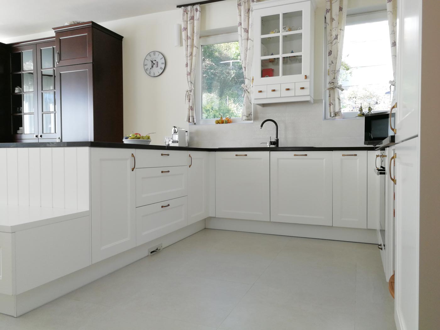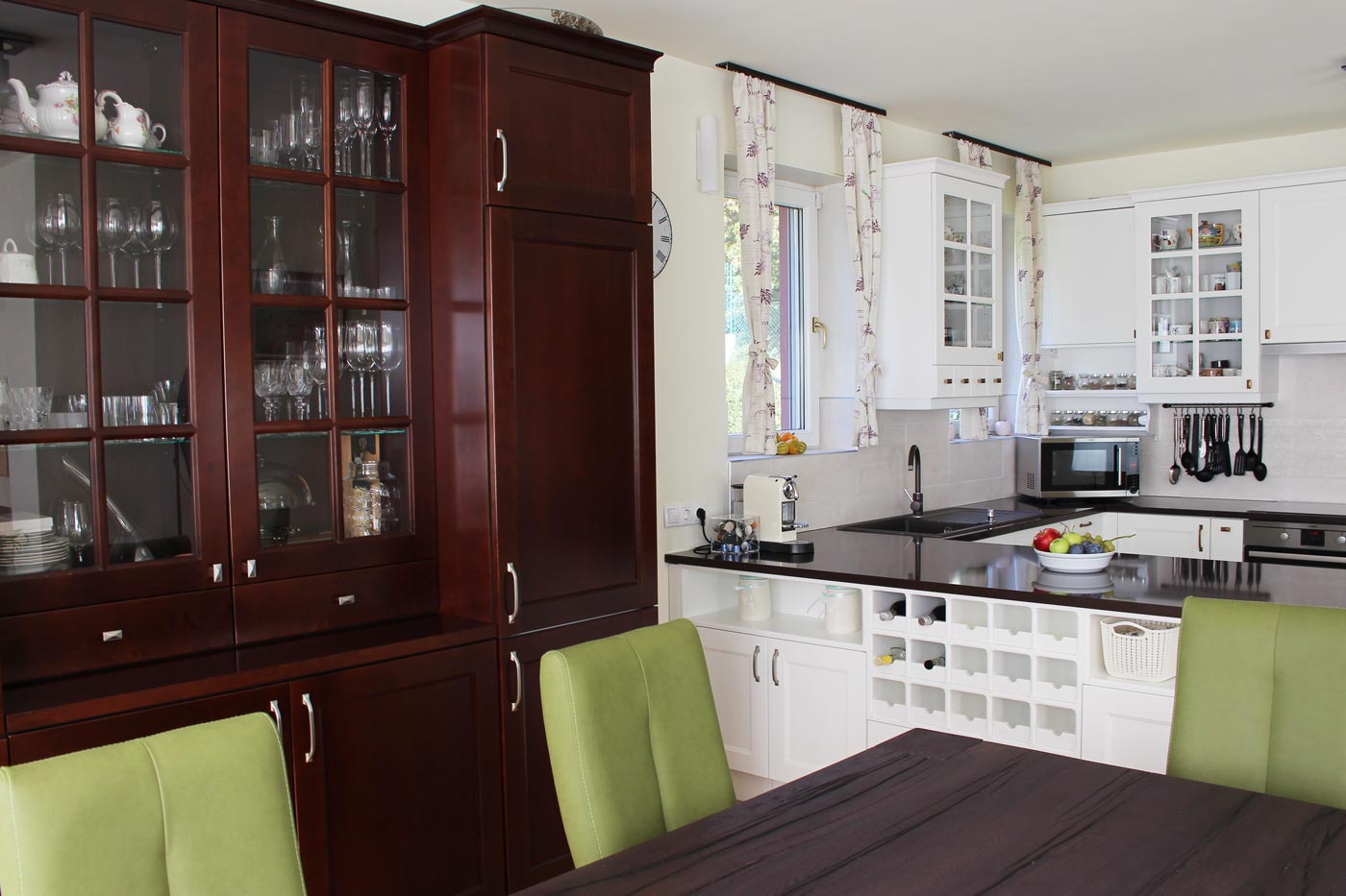 Időtálló megjelenésben győnyörű fehér konyhabútort láthatsz a lenti képeken. Egyik különlegessége, hogy a gyönyörű vintage stílusú konyhabútor kiválóan van kombinálva az étkezőben helyet kapó tálalószekrény eltérő színvilágával.