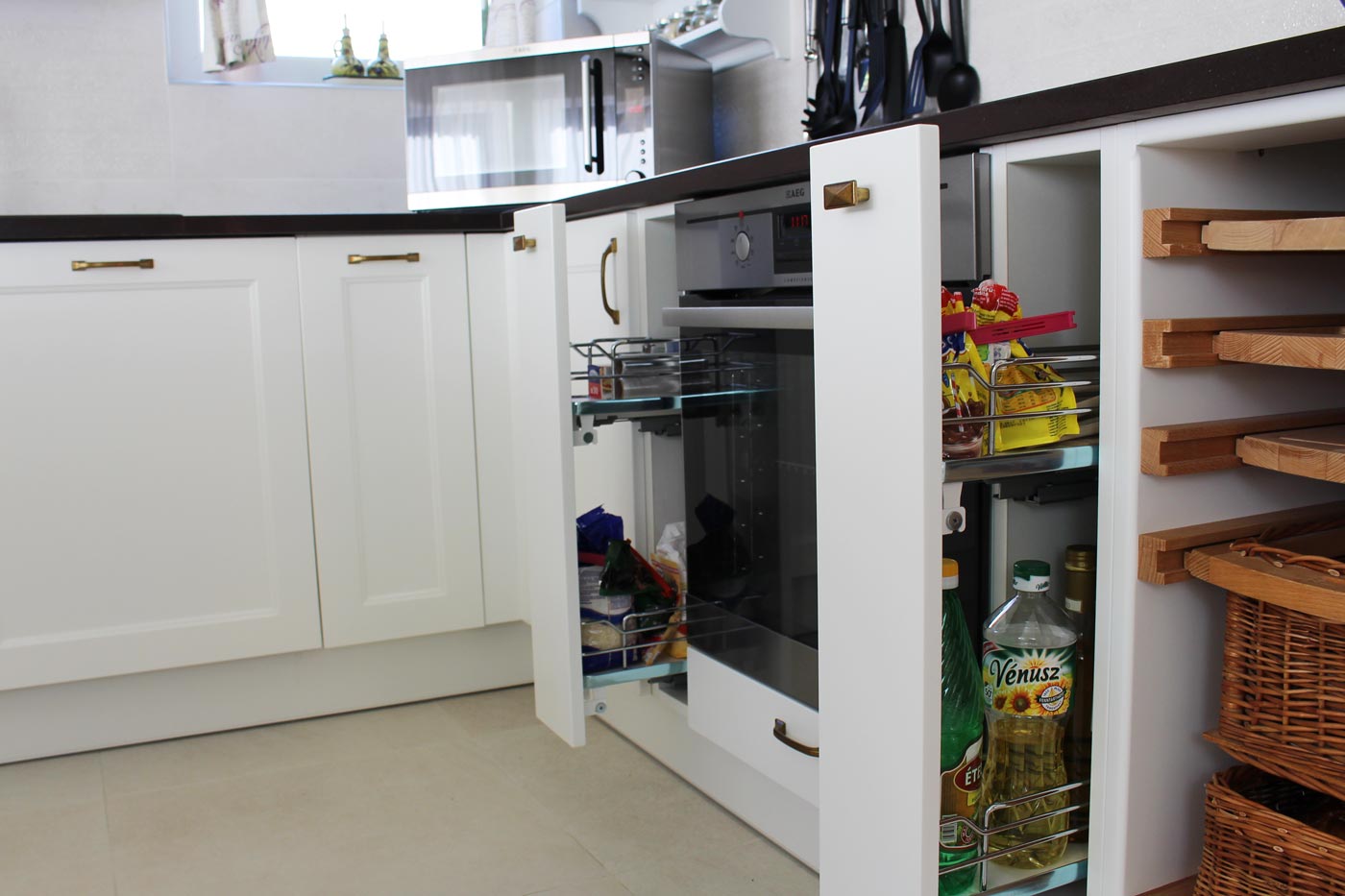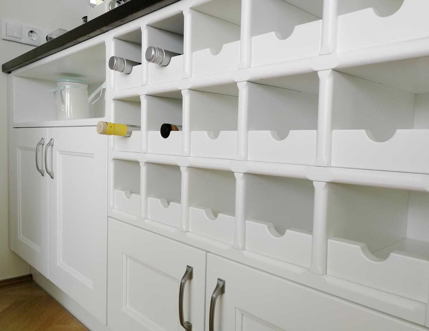 A konyhapult külső részén praktikus tárolórész kapott helyet, ahova a minőségi boroknak is hely lett találva. Ez a fehér konyhabútor akár 15-20 év múlva is stílusos és divatos darabnak fog számítani.