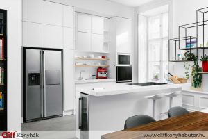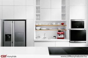 Az ultramodern selyemfényű fehér konyhában, ahol még a felső szekrények is érintésre nyílnak, nincsen helye semmi felesleges dolognak.