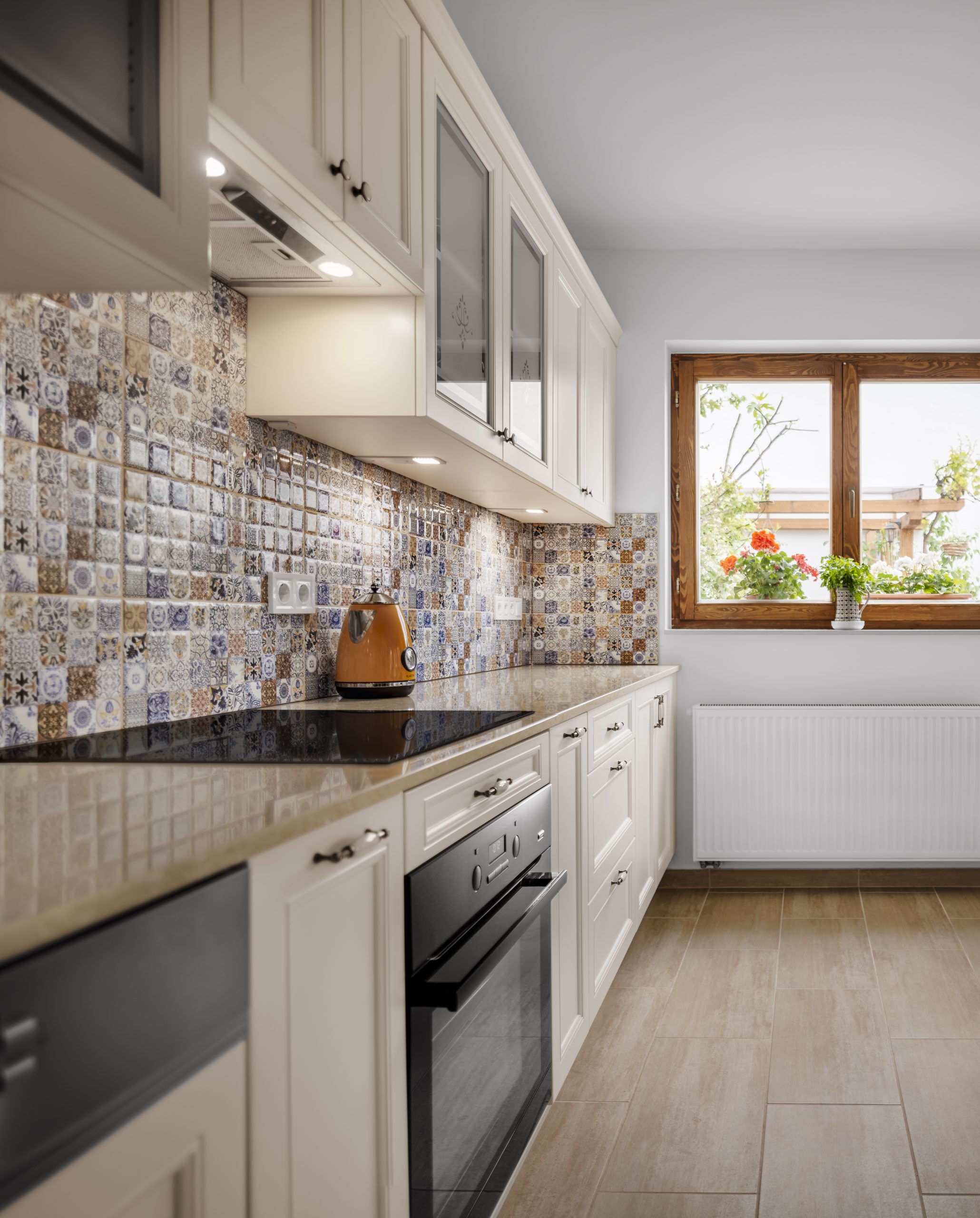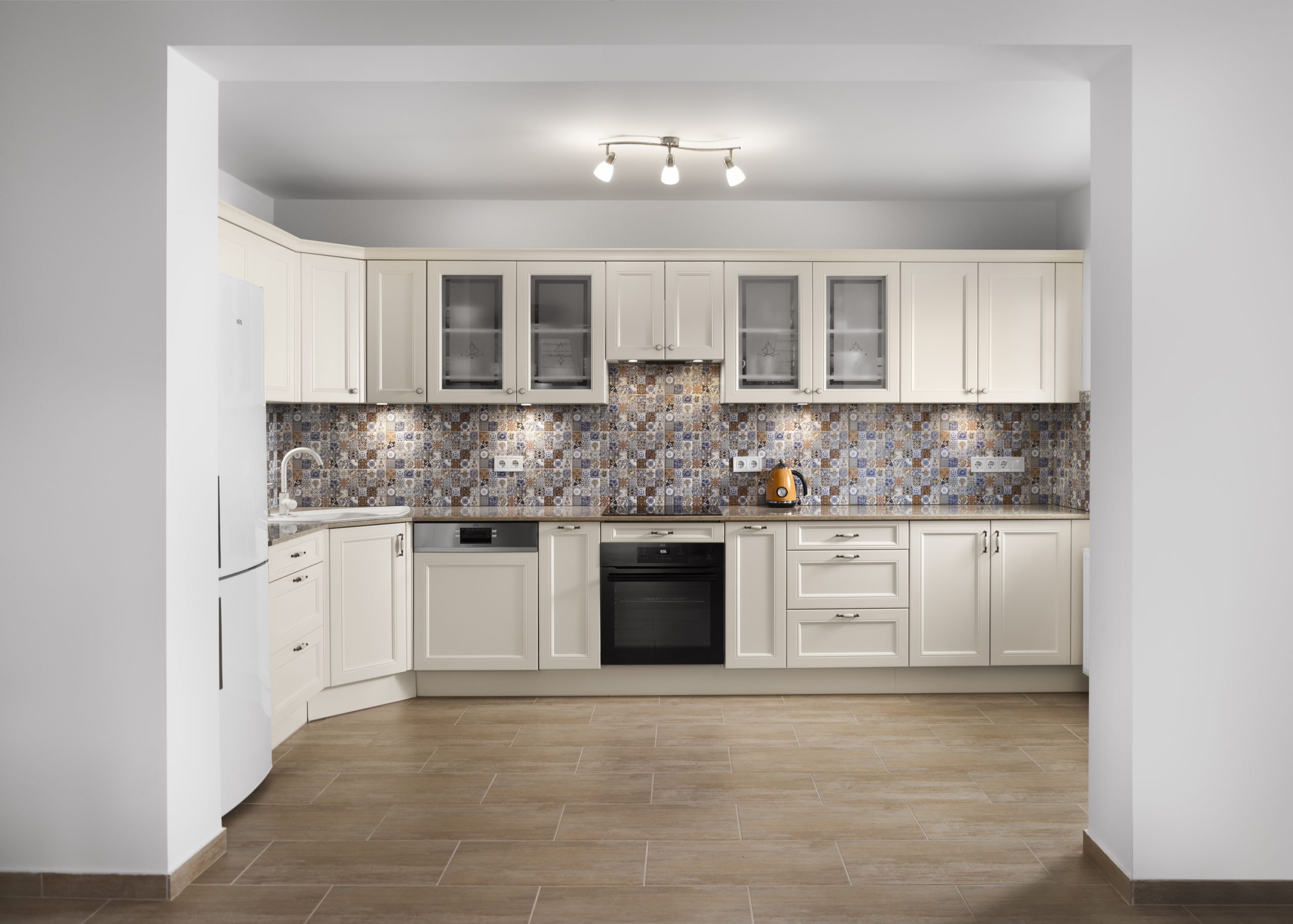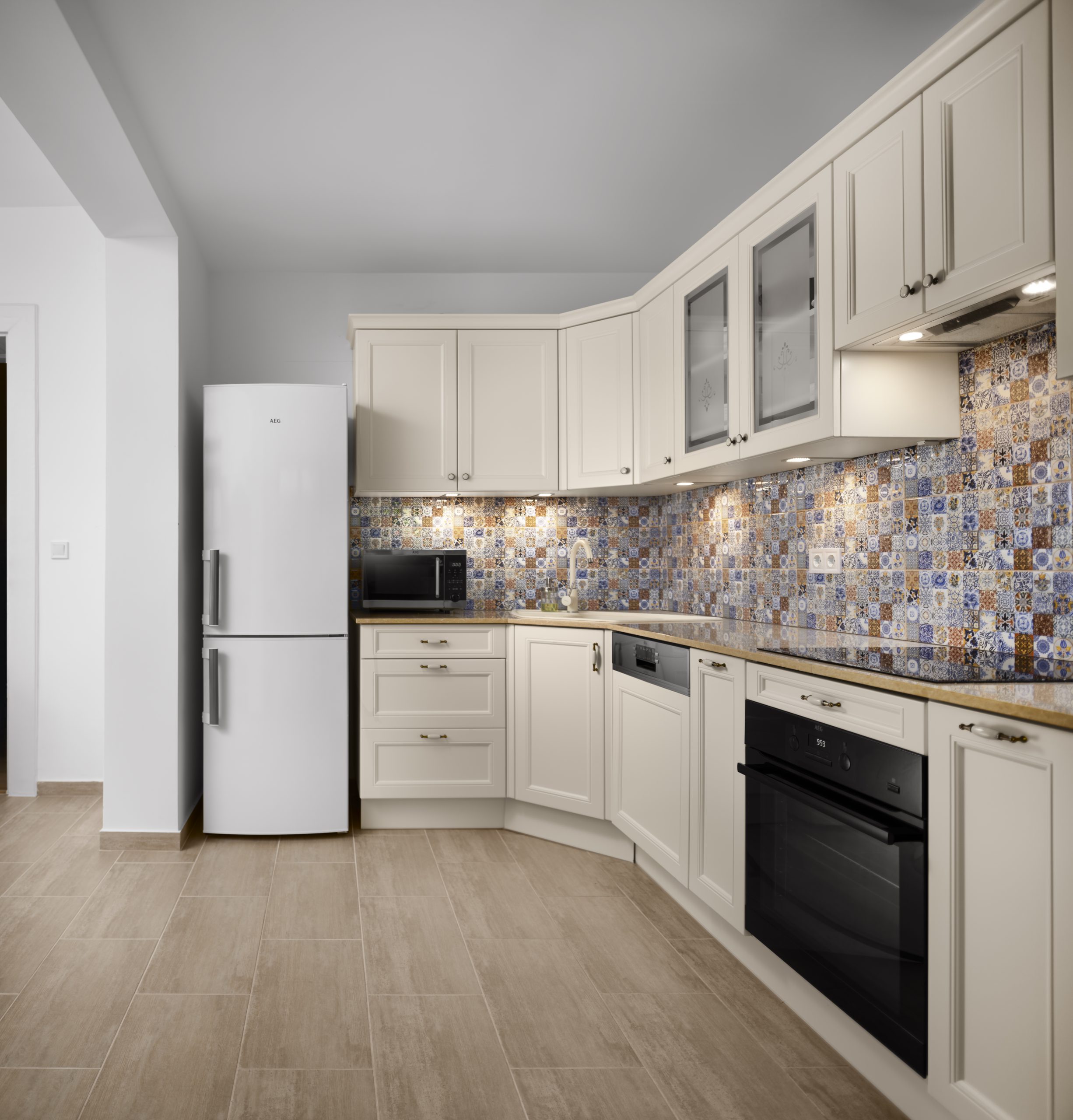Die folgenden Bilder zeigen eine Küche in einem hellen Farbschema für ein Chalet-Haus in Budapest.