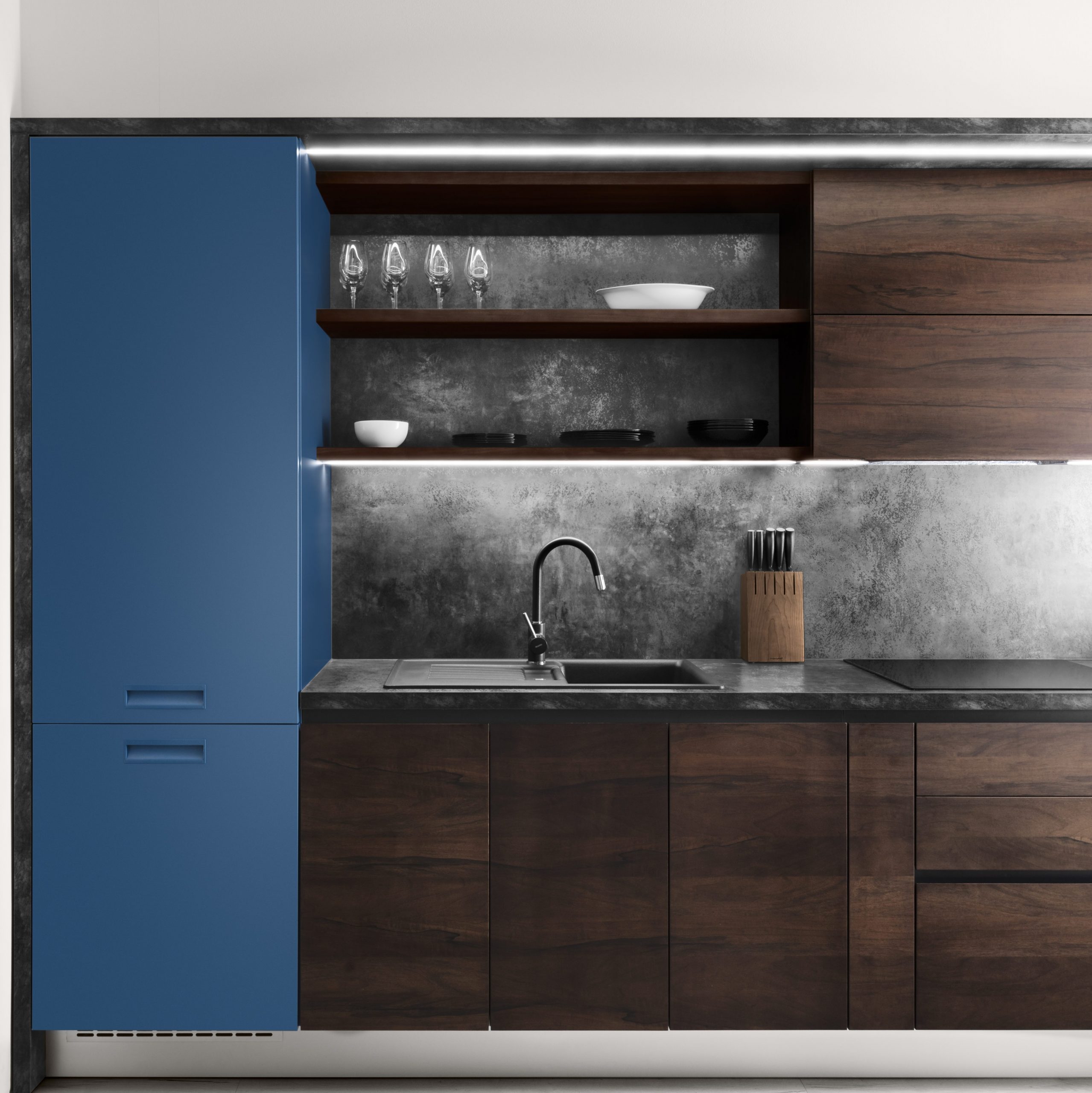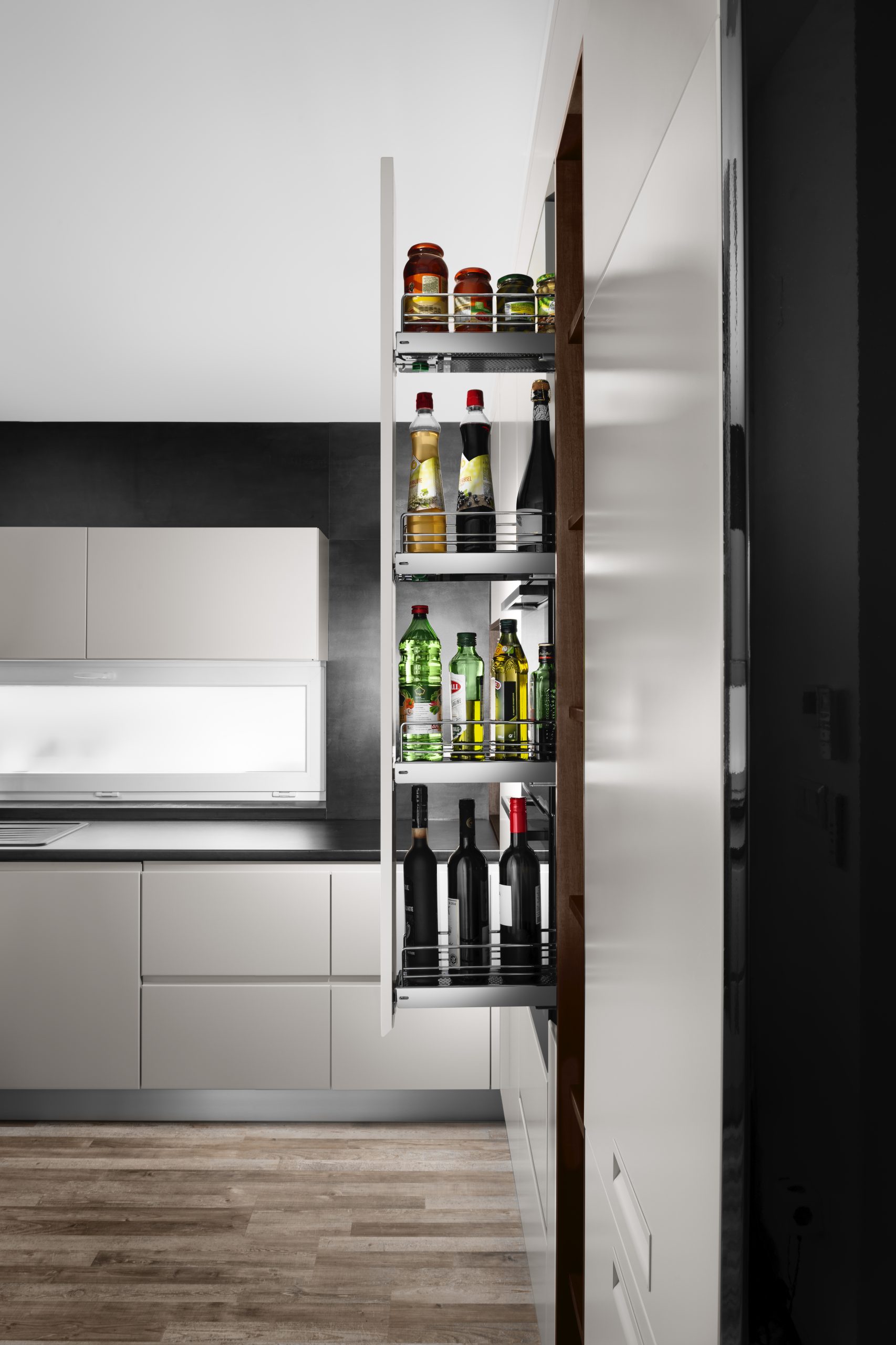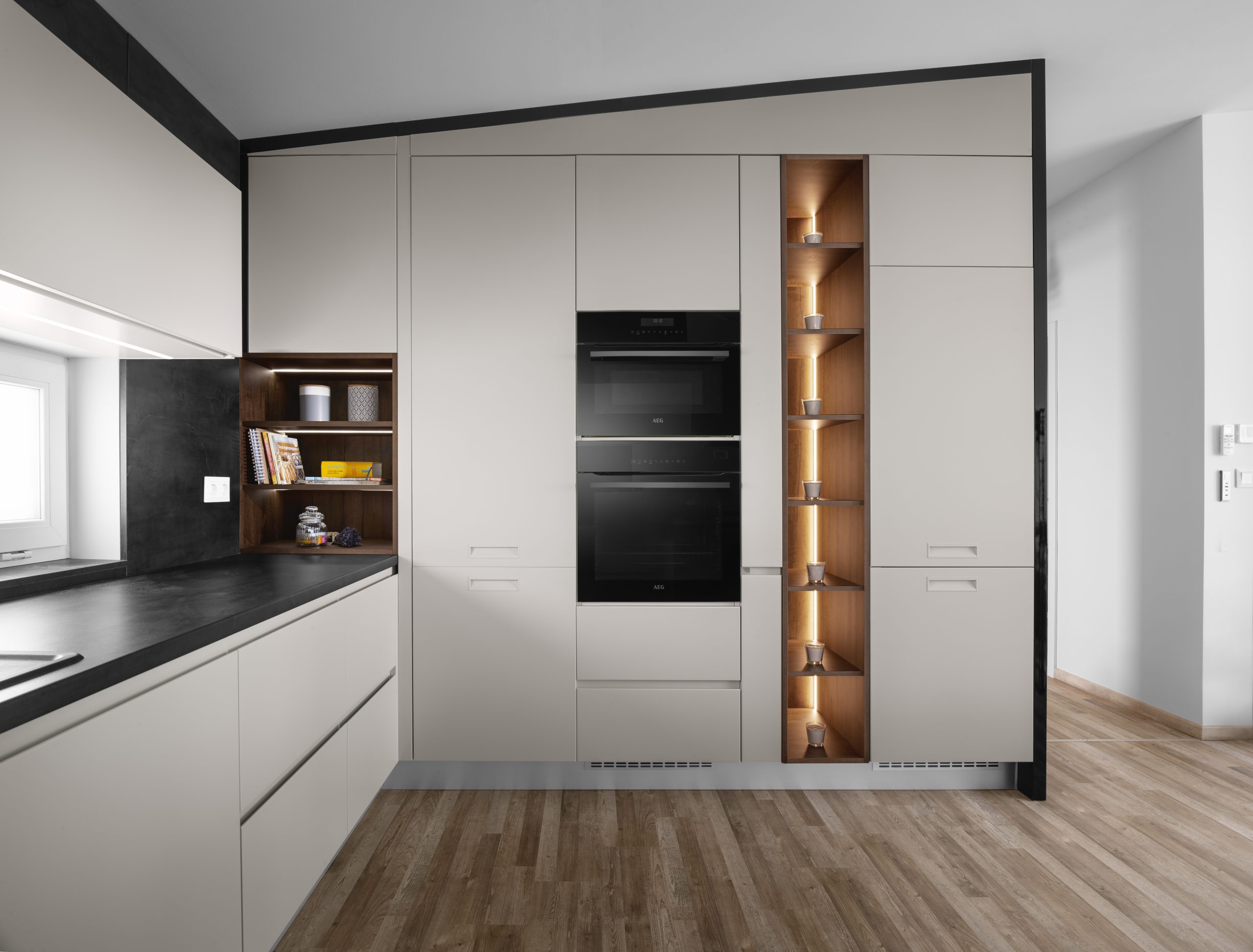 Das verdeckte Griffsystem der Küchenzeile Ivonne in Kombination mit den Push-open-Schranktüren schafft durch die Gestaltung der Front und des Korpus eine klare, transparente Oberfläche. Die einheitliche, homogene Oberfläche wird durch innenliegende Regal- und Ablageelemente für Komfortfunktionen perfekt ergänzt.