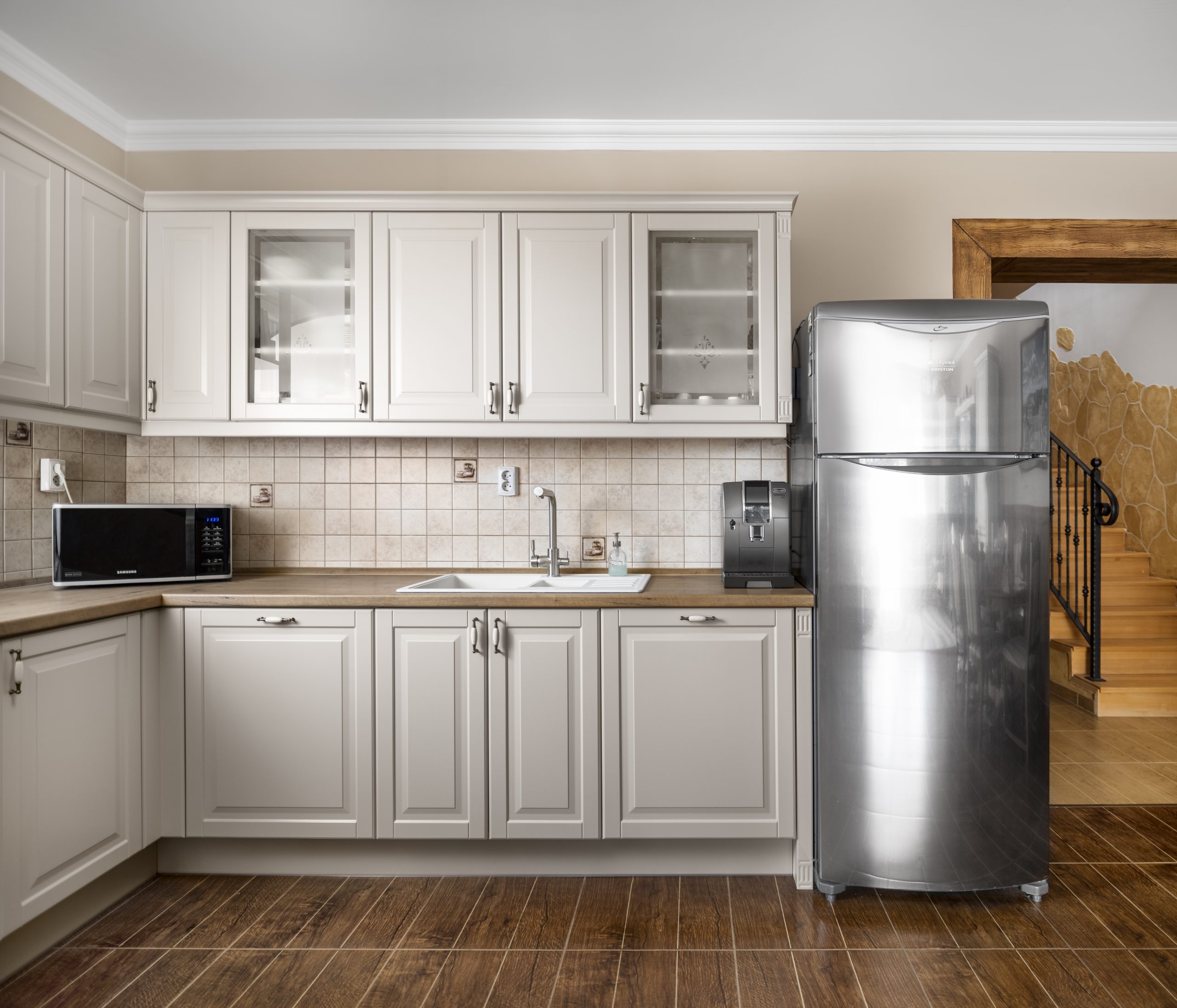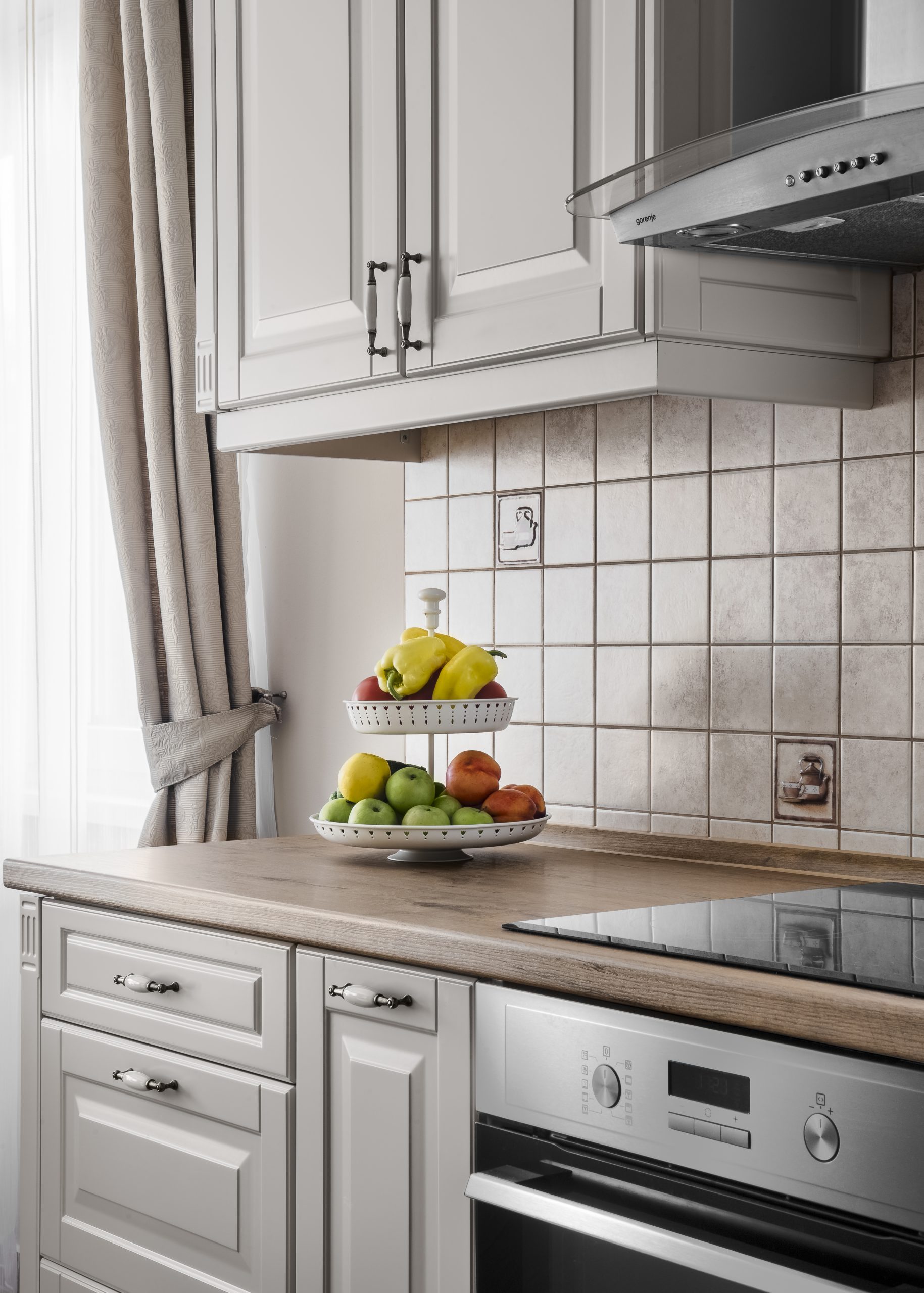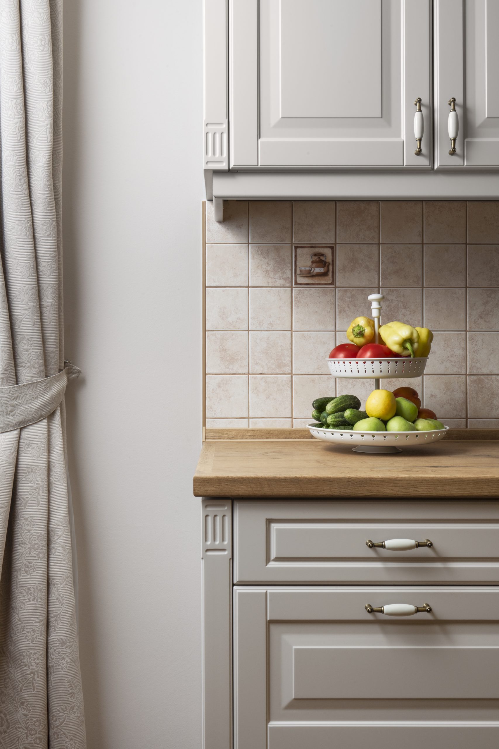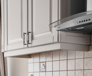 Die Laris-Küchenfront weist ein verziertes, geätztes Muster auf, das der Küche einen romantischen Vintage-Charakter verleiht.