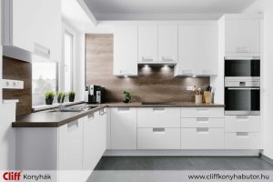 A Palace fehér selyemfényű konyhabútor a teret még tágasabbá teszi, miközben a fahatású felületek eleganciát visznek a praktikusra tervezett térbe.