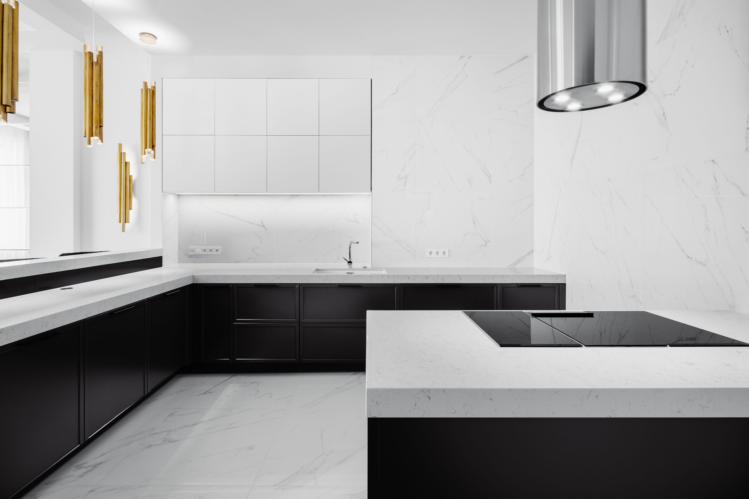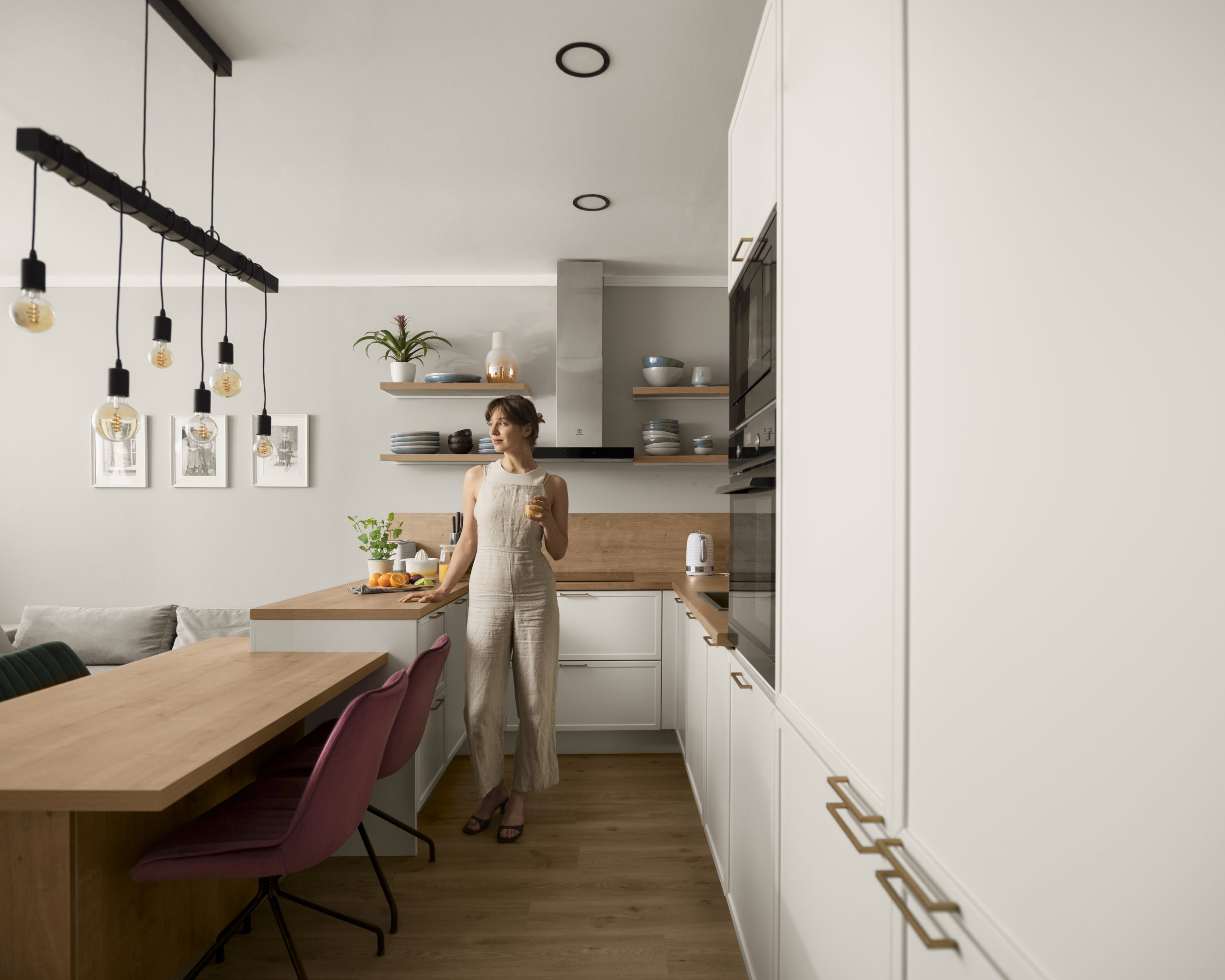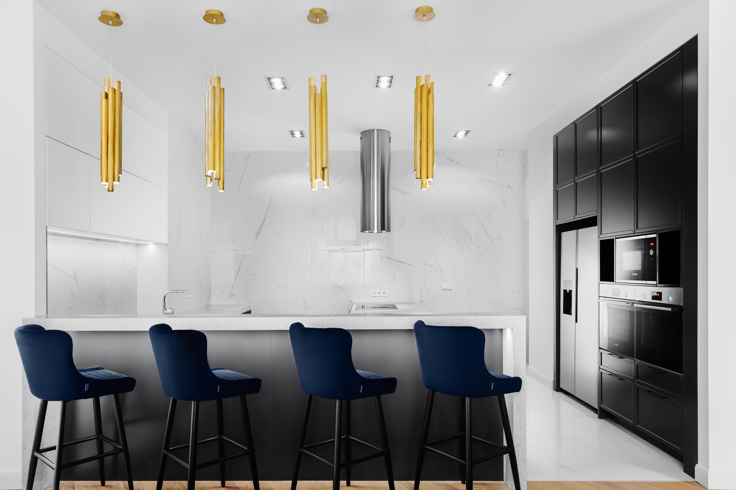 Echter moderner italienischer Stil mit minimalistischem Aussehen gibt Ihnen das elegante, einzigartige Aussehen, das Sie von Cliff-Küchen erwarten. Die seidenglänzende Küche auf dem Bild harmoniert gut mit den Oberflächen und der Stimmung der anderen Räume in der Wohnung, während die dunkelbraune Nussbaumverzierung an der Küchentheke dem Design eine dynamische Note verleiht.