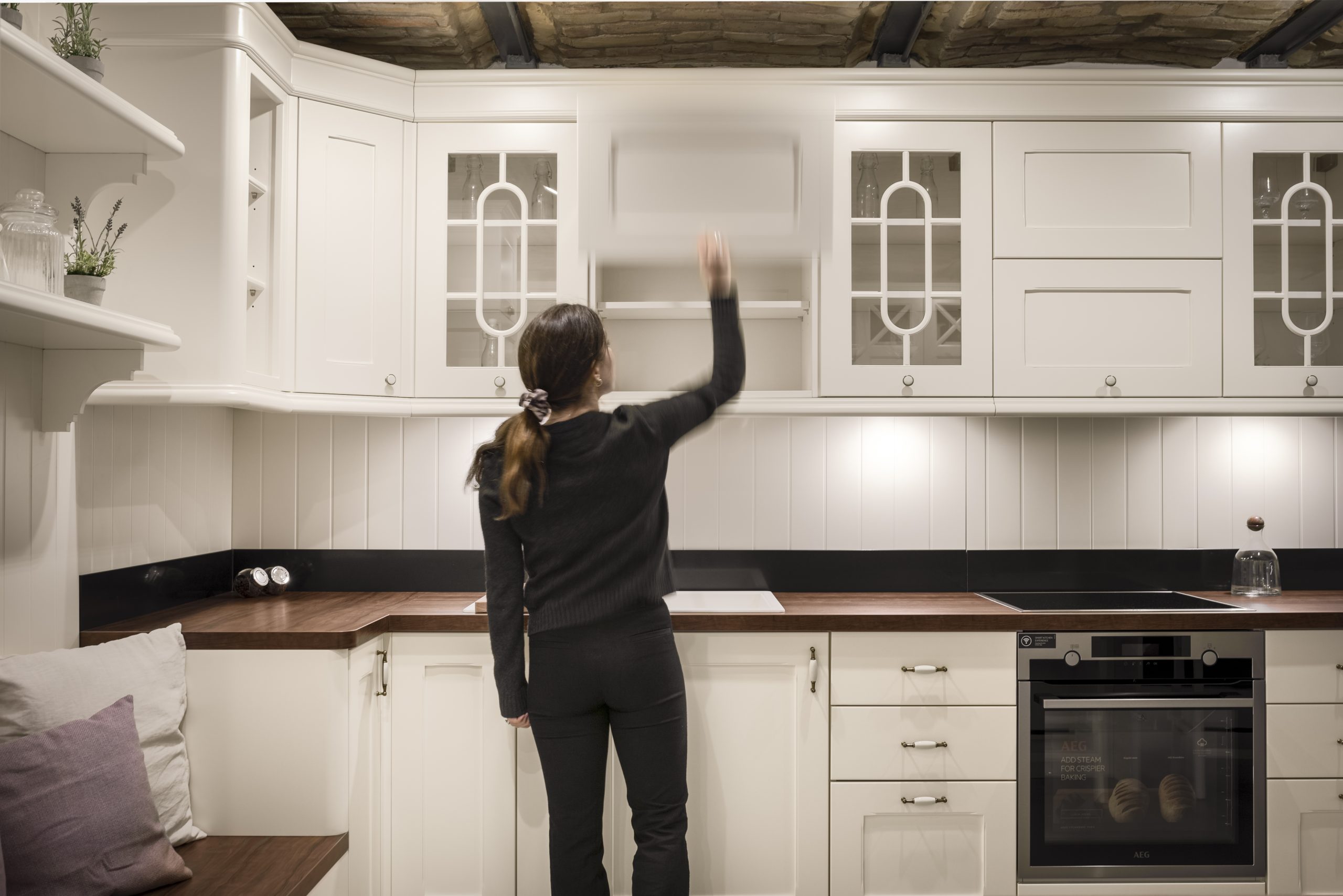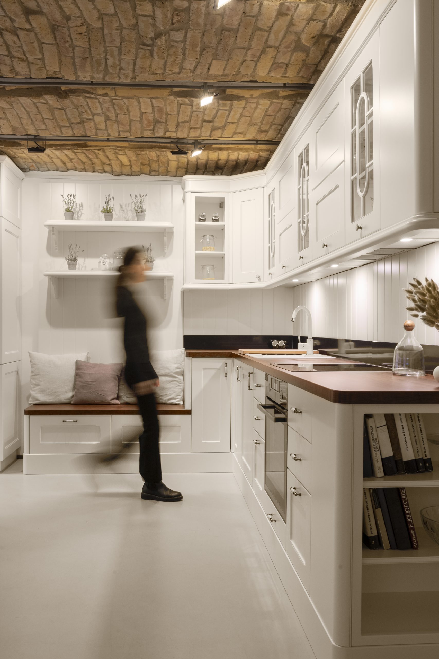 Alle Verzierungen der Shalem-Küchenmöbel sind die dünnen Fräsungen und die sanft geschwungenen Leisten. Die homogenen Flächen sind kaum wahrnehmbar, dennoch bestimmen Proportionssinn und strukturierter Rhythmus den Stil der Küchenmöbel.
